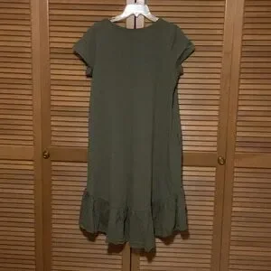 Charming olive green dress with playful ruffle hem. Perfect for any occasion.
