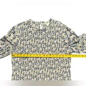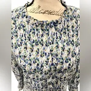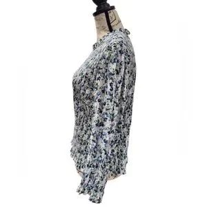 Veronica Beard Kali Smocked pullover blouse, women’s size 14 features a charming puff sleeve design and a stretch smocked bodice, breast darts with ruffle detail on neck, hem and 3/4 sleeve cuffs, all in a soothing blue, white and green floral all over print. 100% cotton lightweight fabric. See pictures for detail and measurements. Ready to ship from our shop.