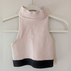 Ribbed texture. High neck design. Racerback style. Comfortable fit.