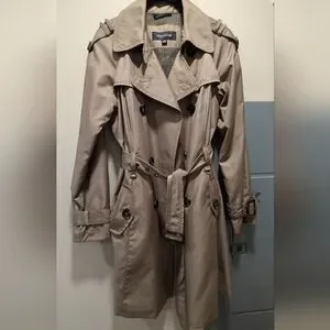 This sophisticated trench coat from Jones New York features a timeless design with a double-breasted front and wide lapels. The tan color and belted waist add a touch of elegance, making it a versatile addition to any wardrobe.