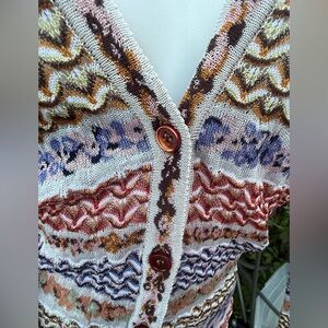 This Missoni women's cardigan is perfect for spring/ summer features the brand’s iconic signature zig zag stripes in a multicolor pattern of shades of red, purple, and cream. Perfect for a cool summer night over a spaghetti strap maxi dress or wide palazzo pants. * Please note there is damage to one wrist hem. Got caught on a fence post!! Maybe a repair is possible? Please see photo. Price reflects this.