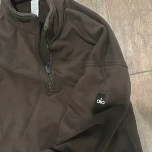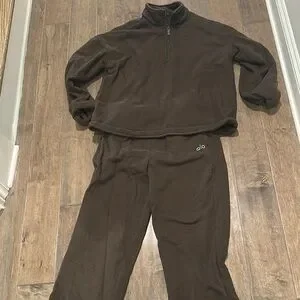 Cozy brown fleece pullover and pants set by Alo. Perfect for lounging or casual outings.