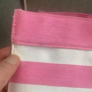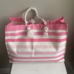 Stylish tote with pink and white stripes. Features rope handles. Perfect for everyday use.