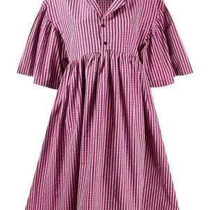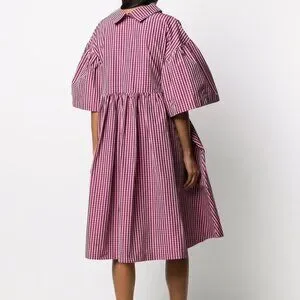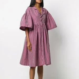 The Balsam Dress from the Henrik Vibskov AW20 collection is a mid-length dress with short puff sleeves, drop shoulders, V-neck, empire line and front button fastening.