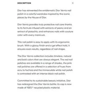 Dior Vernis by Christian Dior is a high-quality nail polish that offers intense and vibrant color coverage.