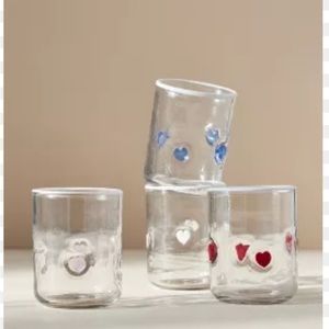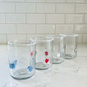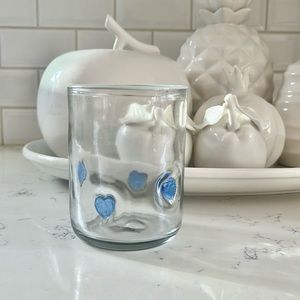 Charming glass tumbler with blue heart accents. Perfect for any dining setting. Not available on website anymore!