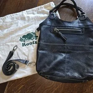Roots Black Leather Shoulder Tote Bag with Detachable Strap