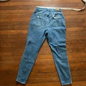 These blue skinny jeans from American Eagle Outfitters feature a stylish distressed design, adding a touch of edge to your casual wardrobe. The denim offers a comfortable fit with a modern skinny silhouette, perfect for everyday wear.