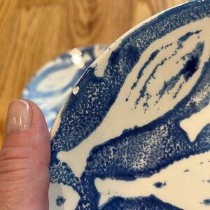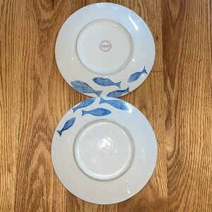 Set of two plates with a blue and white fish pattern. Looking at them they look perfect but if you look really closely one plate has one chip on the edge, the other has 3 small chips on the edge. Would be perfect for decoration. 8 1/2” across.
