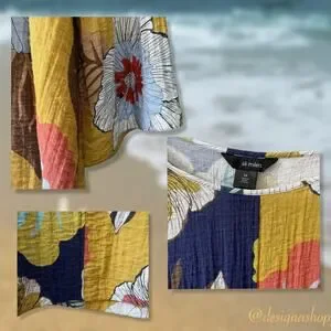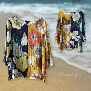 Lightweight, textured pullover with round neck and three-quarter sleeves. Side Slits, Large flowers, and lightweight fabric of Rayon and Nylon make this a great, versatile top for travel, work, cruises, beach, and any other place where you want to wear something comfortable and easy to care for, Artsy, BOHO