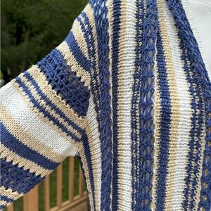 Stay cozy and stylish with this striped blue and cream women's sweater. Perfect for layering, this sweater adds a touch of elegance to any outfit. Open faced waffle like long cardigan sweater, gorgeous colors- blue, tan and cream. Length 38/39 from neckline, P2P 23 natural with lots of give, smoke/pet free home