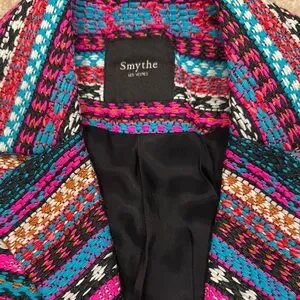 This eye-catching blazer from Smythe showcases a vibrant aztec pattern in pink and blue hues. Crafted from a woven fabric, it features a cropped length and an open-front button up design, making it a perfect statement piece for any occasion. Boxy style, size XS/2