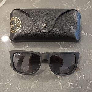 These Ray-Ban sunglasses boast a classic black frame with dark lenses. Included is the protective case. No scratches, in perfect condition.