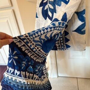 Elegant swim cover-up featuring a striking blue and white floral design. Perfect for a day at the beach or poolside lounging.
