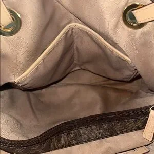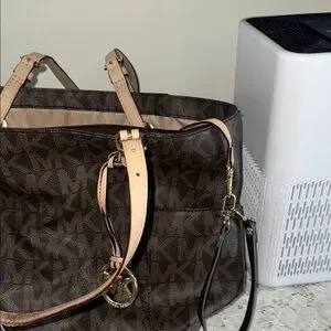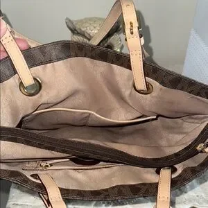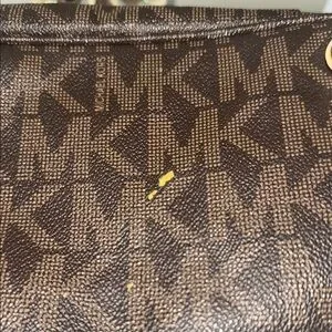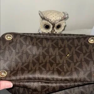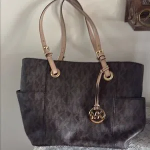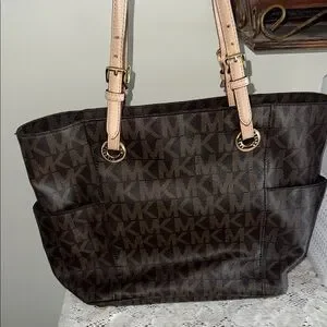 This Michael Kors tote features a rich brown hue adorned with the iconic MK monogram, exuding timeless elegance. The structured design is enhanced by tan leather shoulder straps, providing both style and practicality. Ideal for daily use, it reflects the classic sophistication synonymous with Michael Kors. Please see pics of small imperfections. On the bottom, wear on straps, and small hole in material on the inside and label inside .
