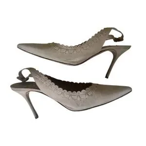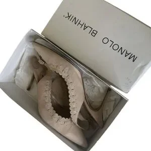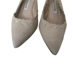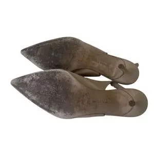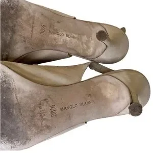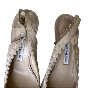 MANOLO BLAHNIK Beige Suede Slingback Heels is worn. Please see all photos I tried to clean it flawed with discoloration on the inside of the heel, not noticeable. Please see all photos! Still has a lot of life live can be cleaned if taken into a professional shoe maker.