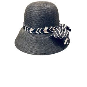 This sophisticated cloche hat by Betmar features a striking black and white zebra-patterned band that adds a touch of elegance to its classic design. The hat's rounded crown and short, curved brim offer a timeless silhouette, making it a versatile accessory for any occasion.