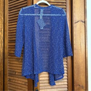 NWT Chicos lightweight open-weave cardigan, 3/4-sleeve, beautiful sapphire blue w/ white speckles, Chicos size 0 (S). Can also be tied in front.