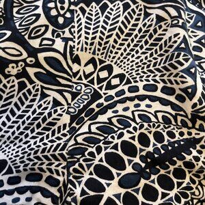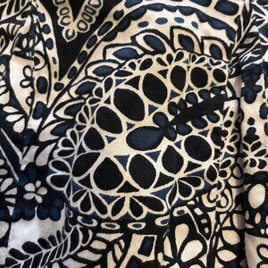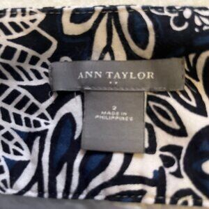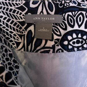 This Ann Taylor skirt can put the fun in everyday life! The desgin is mostly black and white with a few subtle blue black accents. It is tapered near the top and flares at the bottom to give a ‘twirly’ affect when turning. The lining is white. The waistband has four (4) white buttons, and the side has a hidden zipper,