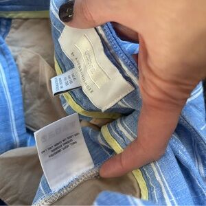 Stylish wide leg linen chambray blue pants with white stripes. Perfect for casual or dressy occasions. Comfortable and chic split leg design. Ett:Twa brand for Anthropologie. Very good condition.