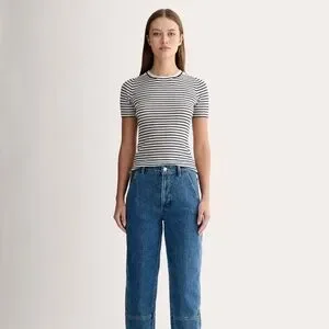 The shape of things to come. Made of regenerative cotton denim with just a touch of stretch the Utility Barrel Jean is complete with a waist-nipping high rise a cool curved leg and an easy cropped length. Plus it has utilitarian details like accent stitching and patch pockets for a craftsman-inspired look. Everlane Women's Utility Barrel Pant in New Blue, Size 25
