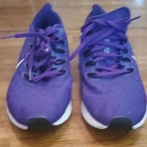 Experience the perfect blend of style and functionality with these Nike athletic shoes. Featuring a striking purple and white color scheme, these shoes are designed for optimal performance and comfort. Ideal for running or training, they offer a sleek and modern silhouette that enhances your athletic endeavors.