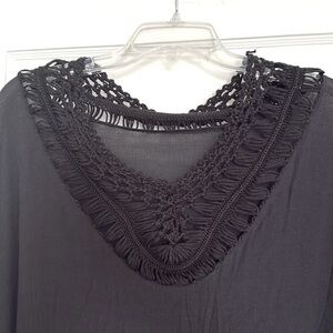 Stay stylish with this black beach cover-up with fun crochet detail at edges and v-neck front. Tag is missing but size is a Large. Length 35-40”