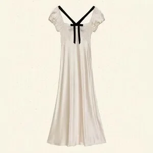 Rendered in a buttery silk satin, the ‘30s-inspired Sabrina Dress features short puffed sleeves and a square neckline threaded with a contrast velvet ribbon. Intricate floral lace insets adorn the bodice, and an invisible side zipper gives way to an ankle-grazing, bias-cut skirt.