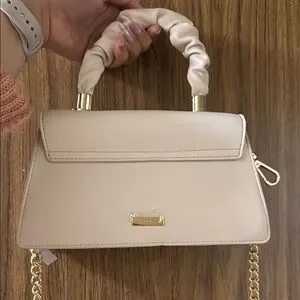 This stylish cream handbag features chic gold accents and a unique handle design. Perfect for any occasion, it adds a touch of elegance to your outfit.