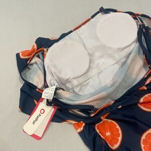 Brand new with tags! Orig $59. PatPat 1-piece convertible swimsuit in rare, hard to find Citrus Orange Slices / Tropical theme. Women's size medium / Med / M. Stretchy ruffle band goes across top and can be worn across upper arms so shoulders show, or worn up on top of shoulders for more coverage. The 2 adjustable straps can be adjusted for length, removed for a strapless look, criss-crossed in back, or just one can be left on for an asymmetrical, one-shoulder look. Dark navy blue background with orange slices in orange and white. Bra cups can be removed. So cute and summery! Perfect for spring, summer, swim, vacation, cruise, pool, lake, beach, beachy, HTF.