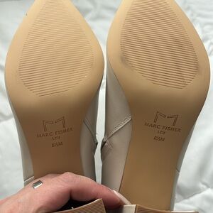 These are brand new never worn outside the house Marc Fisher heeled boots in a sophisticated cream color feature a sleek, minimalist design with a pointed toe and a comfortable block heel. Crafted from smooth leather, they offer a contemporary look that pairs effortlessly with various outfits.