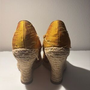 NEVER WORN, Golden yellow wedges from Hype, featuring a chic peep-toe design. The wedge heel offers a comfortable lift, making them perfect for both casual outings and dressy occasions. 4” heel crafted with attention to detail, these shoes are a must-have for any summer fun fashion-forward wardrobe.