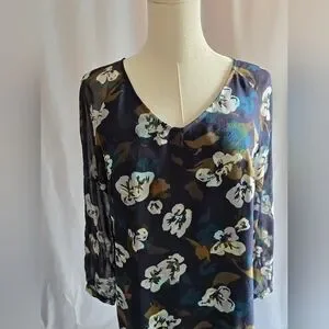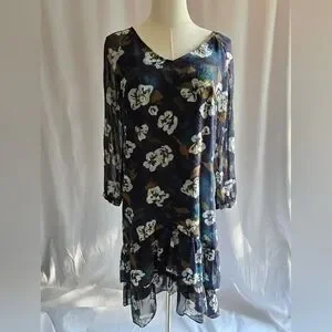 Key Info: Cabi, Floral, Shift Dress, Ruffle Hem, Long Sleeves, Blue Multi, V-Neck, Pirouette