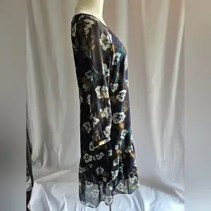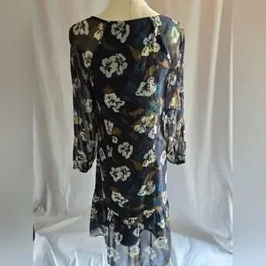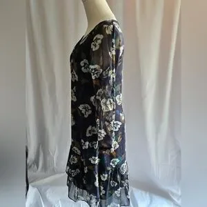 Cabi Pirouette Floral V-Neck Shift Dress Long-Sleeve Ruffle Hem Blue Multi Sz XS