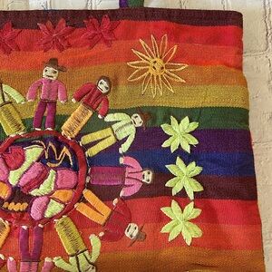 Vibrant tote bag featuring a multicolor embroidered design. Perfect for adding a pop of color to any outfit. Embroidered people, flowers and sun.