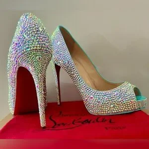 Excellent preloved condition! These authentic Louboutins have been my favorite project to date! Bottoms have been repainted by cobbler and shoes have been professionally hand strassed with over 6000 aurora borealis crystals. I am offering these at an excellent price point due to the after market strassing and bottom repairs! They look nearly brand new when wearing!!