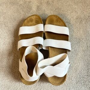 The footbed is cork-like for comfort and support. Gently used with visible wear on the footbed, but overall still functional and wearable.
