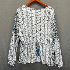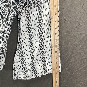 This Ariat blouse features a striking black and white graphic design, complemented by relaxed 3/4 bell sleeves. The lightweight fabric and intricate pattern make it an ideal choice for a casual yet stylish ensemble. Excellent condition, Taking offers and willing to negotiate