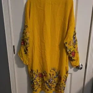 This oversized tunic/kimono features a vibrant yellow hue with intricate embellishments that add a touch of elegance. The 3/4 sleeves and boxy fit make it a comfortable yet stylish choice for any occasion.