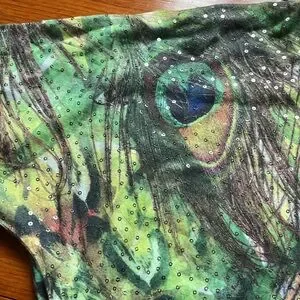 Vibrant shirt with a peacock feather design. Features shades of green, pink, blue, brown, and black. Sequins on front of shirt for added sparkle, and cold shoulder dolman sleeves. Super soft and fun top.