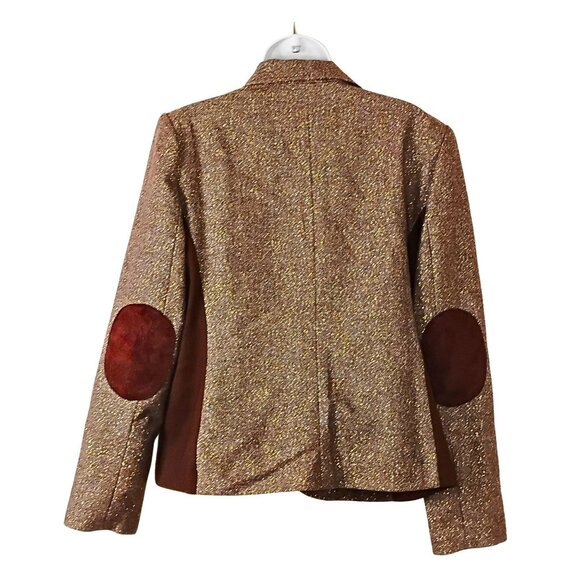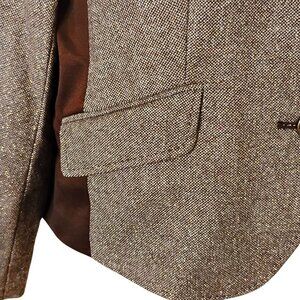 A sophisticated tweed blazer with brown elbow patches and a tailored silhouette. Crafted with a polyester-wool blend, ideal for professional and refined settings.
