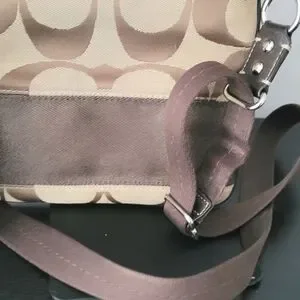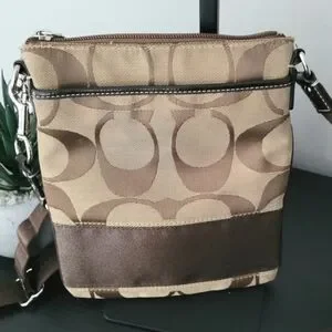 Coach tan and brown signature crossbody bag. Good used condition. Some minor wear and a little discoloration along the pocket, all shown in photos.
