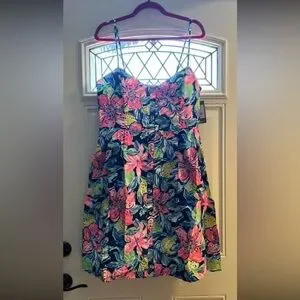 NWT Lilly Pulitzer Easton Dress in Capri Soleli. Smocked back, pockets, gold buttons.