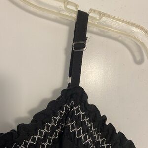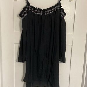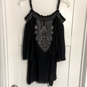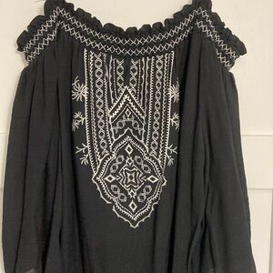 Chic and stylish black off-shoulder top with intricate white embroidery. Perfect for casual outings or a night out.