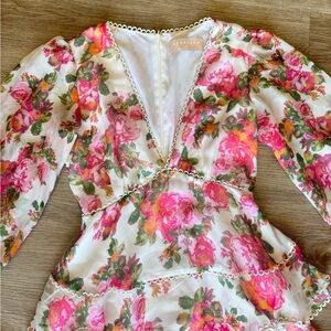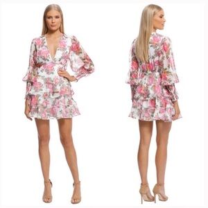 Beautiful floral mini dress featuring a deep V-neck and layered design.