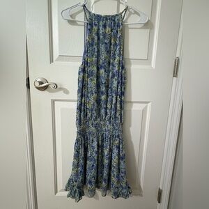 This sleeveless sundress by Ramy Brook features a halter neckline and a vibrant blend of blue and green hues. The dress is designed with pleated and smocked details, offering a relaxed fit perfect for casual or resort wear. Its lightweight fabric ensures comfort and style in warm weather.