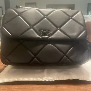 This luxurious black handbag features a quilted design with a distinctive diamond pattern, offering a sophisticated and elegant look. The soft, matte finish and classic flap-style closure add to its timeless appeal, making it a perfect accessory for any occasion.