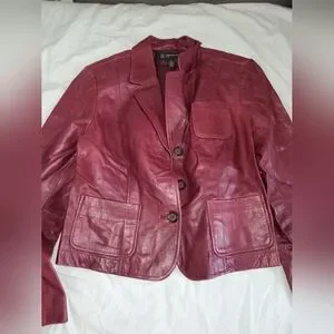Stylish red leather jacket. Features button closure. Perfect for any occasion.