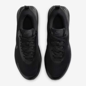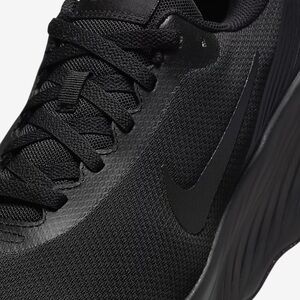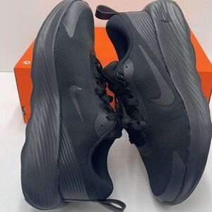 These Nike athletic shoes feature a sleek, all-black design perfect for running. The shoes boast a modern silhouette with a thick, curved midsole for enhanced comfort and performance. The mesh upper and traditional lacing system ensure a snug fit, while the subtle Nike swoosh adds a touch of style.
