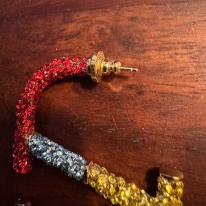 These striking Valentino Garavani earrings feature a bold geometric design with a captivating red and yellow color palette. Crafted with a modern abstract flair, they are perfect for making a statement. The earrings' unique asymmetrical style ensures a standout look for any occasion.